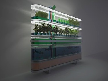 自律したエコシステムで食料を飼育栽培する「バイオスフェア」。最下段は魚を飼育する水槽。