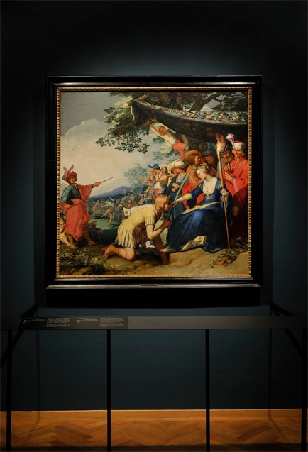 アブラハム・ブルマートの作品は(左下)は、古代ギリシャの小説「エチオピア物語」の一場面をモチーフにした珍しい絵だ(1626)。この作品もファン・デル・ハイデンの風景画同様、非常に高い位置に展示されていたため、テアゲネスとカリクレイアの物語を描いたディテールを読み取れた来観客は多くはなかっただろう。
