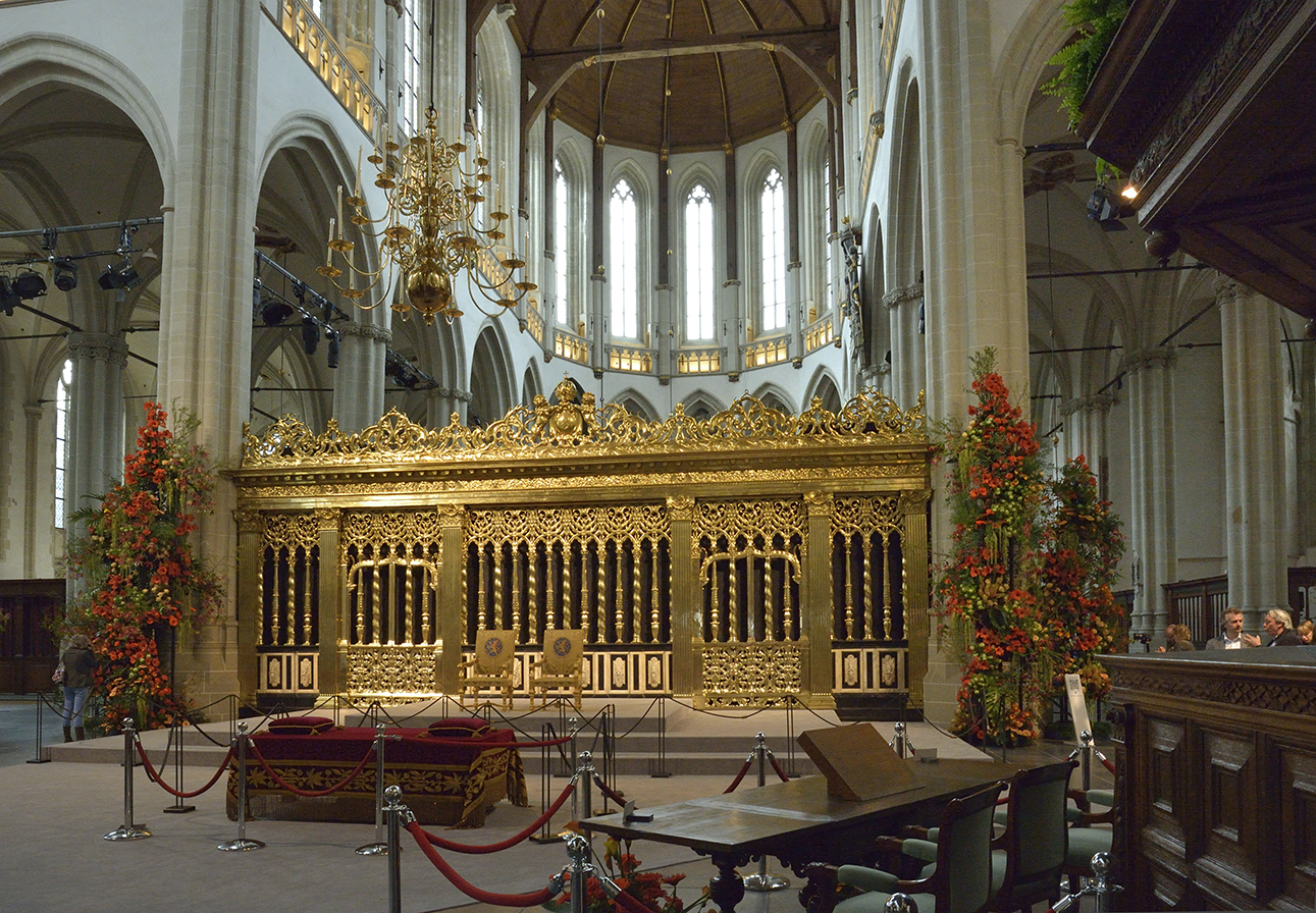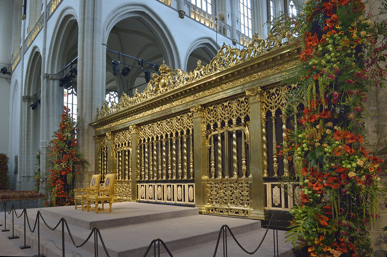 去る4月30日、天皇陛下や雅子様を始め、世界各国君主が一堂に会したオランダ国王即位式。その翌日と翌々日、会場となった新教会は、式のセッティングをそのままに一般公開された。5月2日の早朝、一般プレスのための公開時間が設けられたので見学してきた。