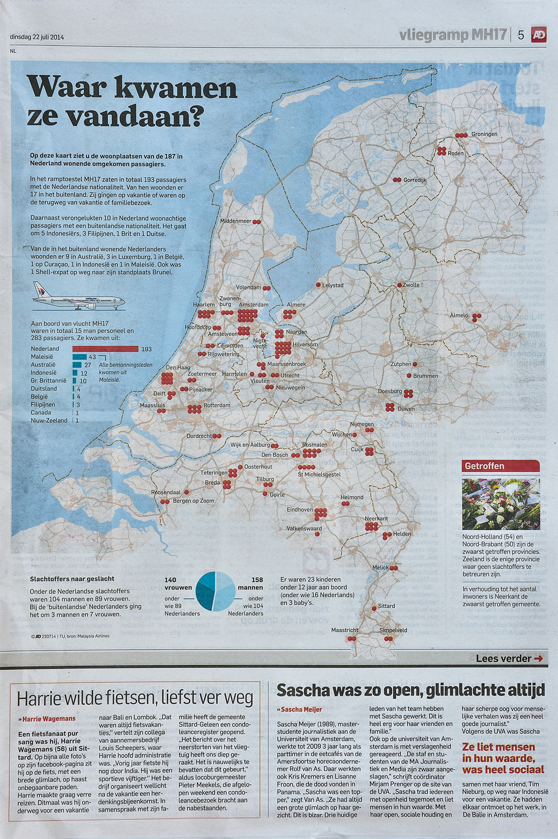 被害者たちがどの地域に住んでいたかを示す地図も掲載されていた。ほとんどの主要都市とその周辺にマークがある。多くのオランダ人にとって、被害者、そして遺族は身近な存在だ。