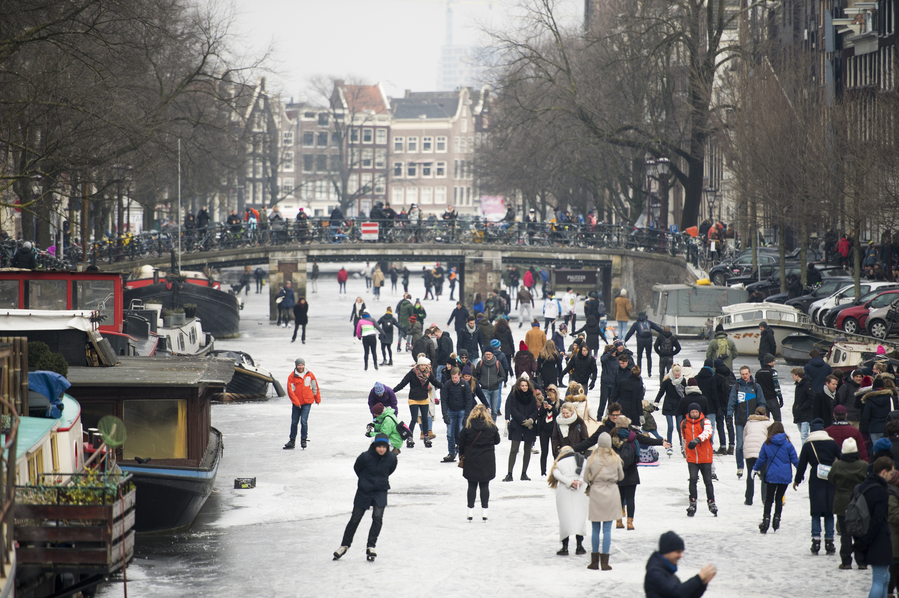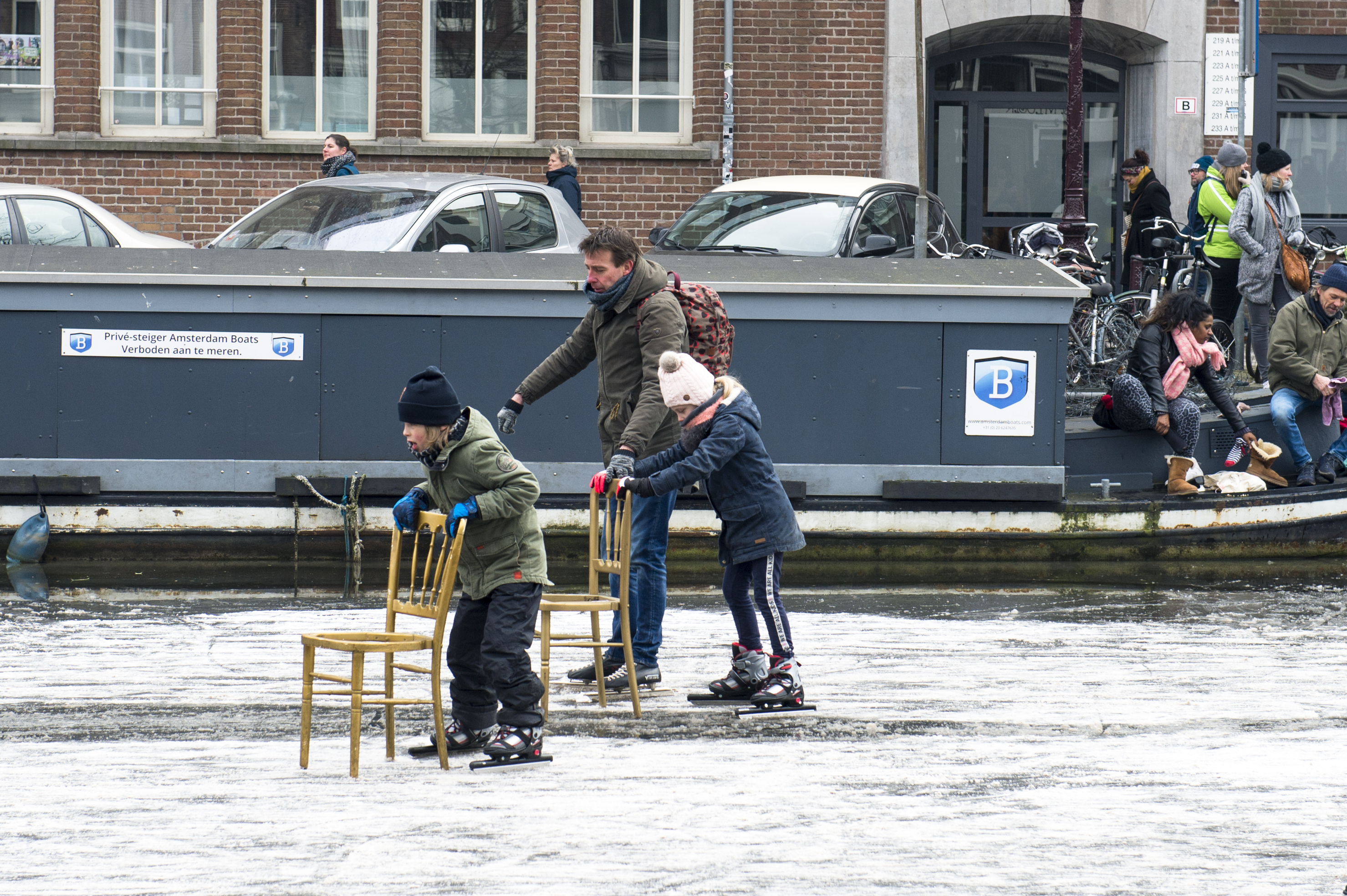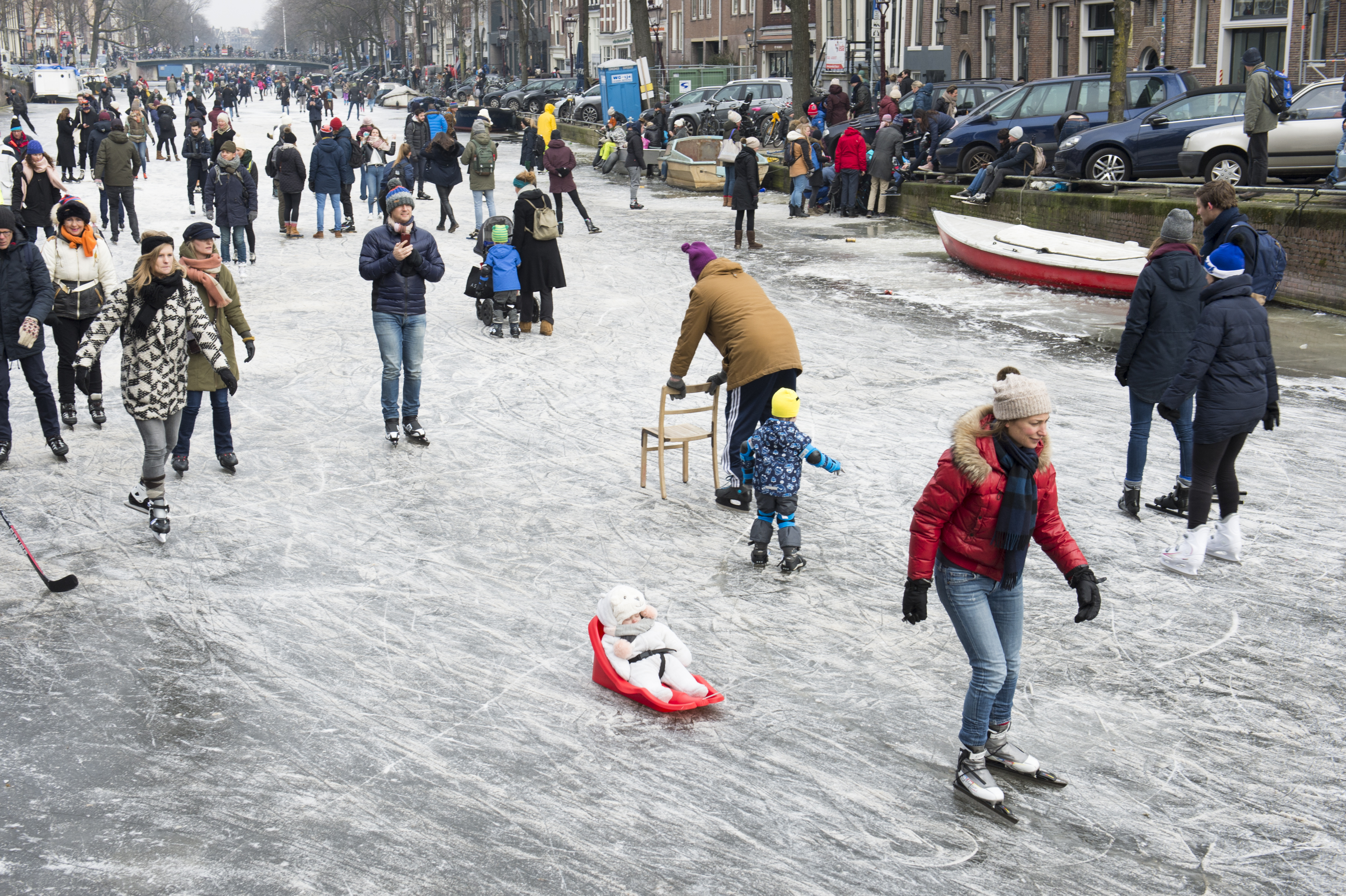 そんな努力のお陰で、プリンセン運河の一部を始め各所に厚い氷が張り、街中がスケートリンクに変身。こんな風にアムステルダムの運河が凍ったのは6年ぶりだ。