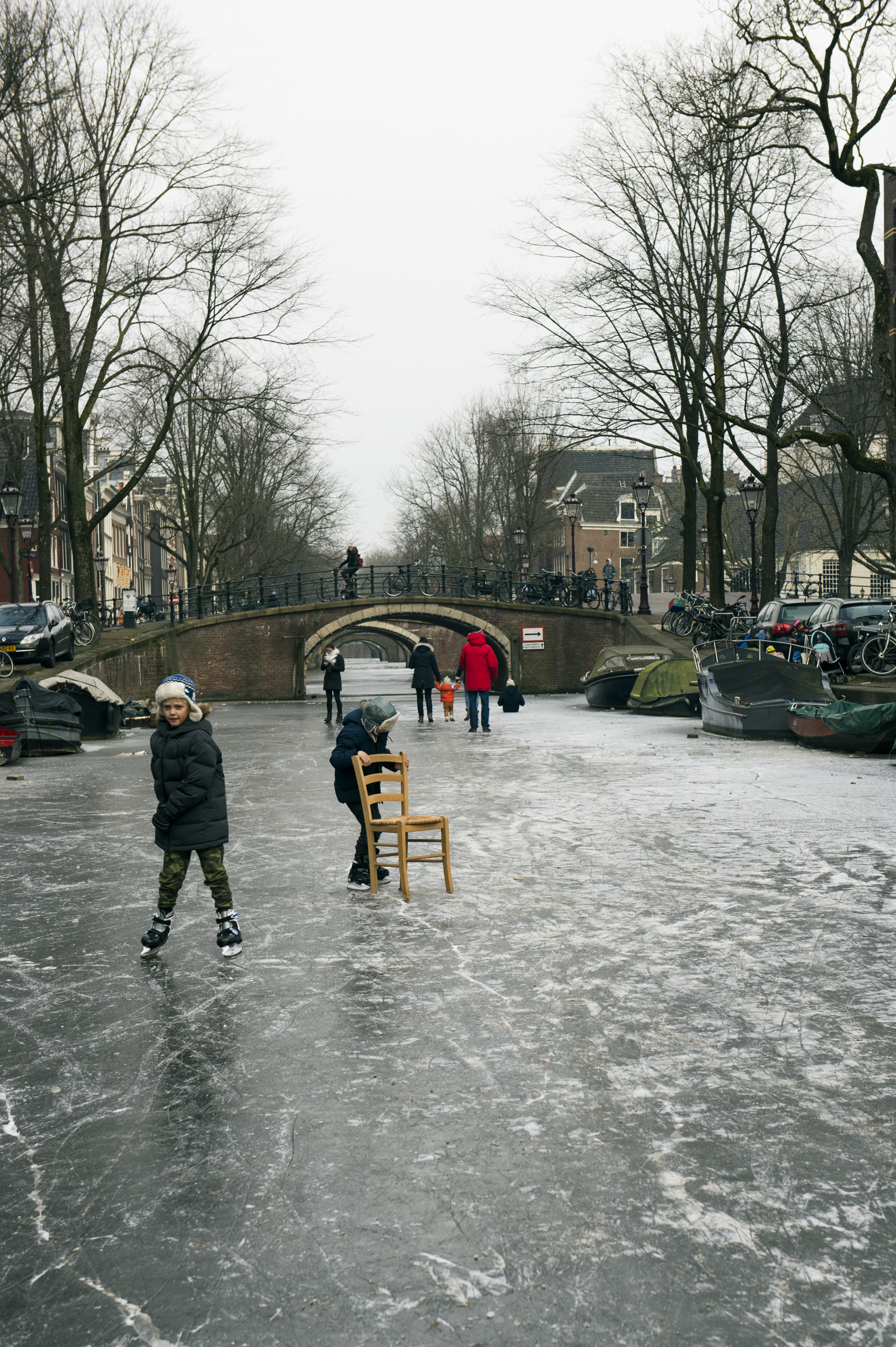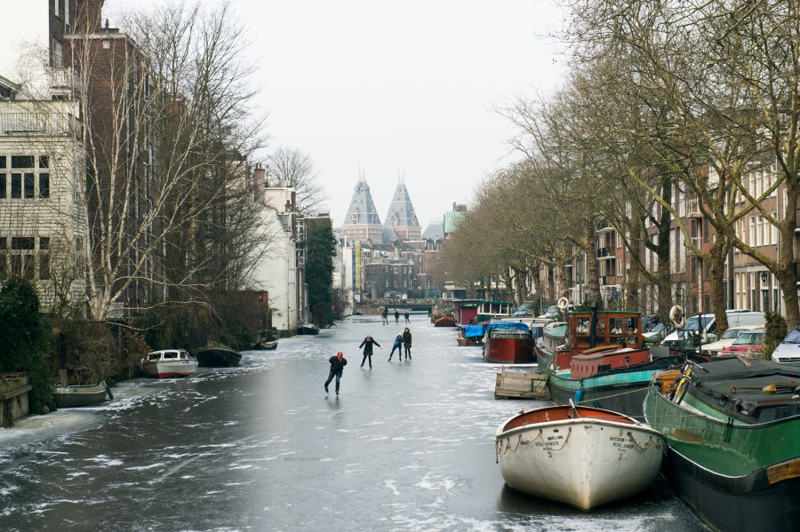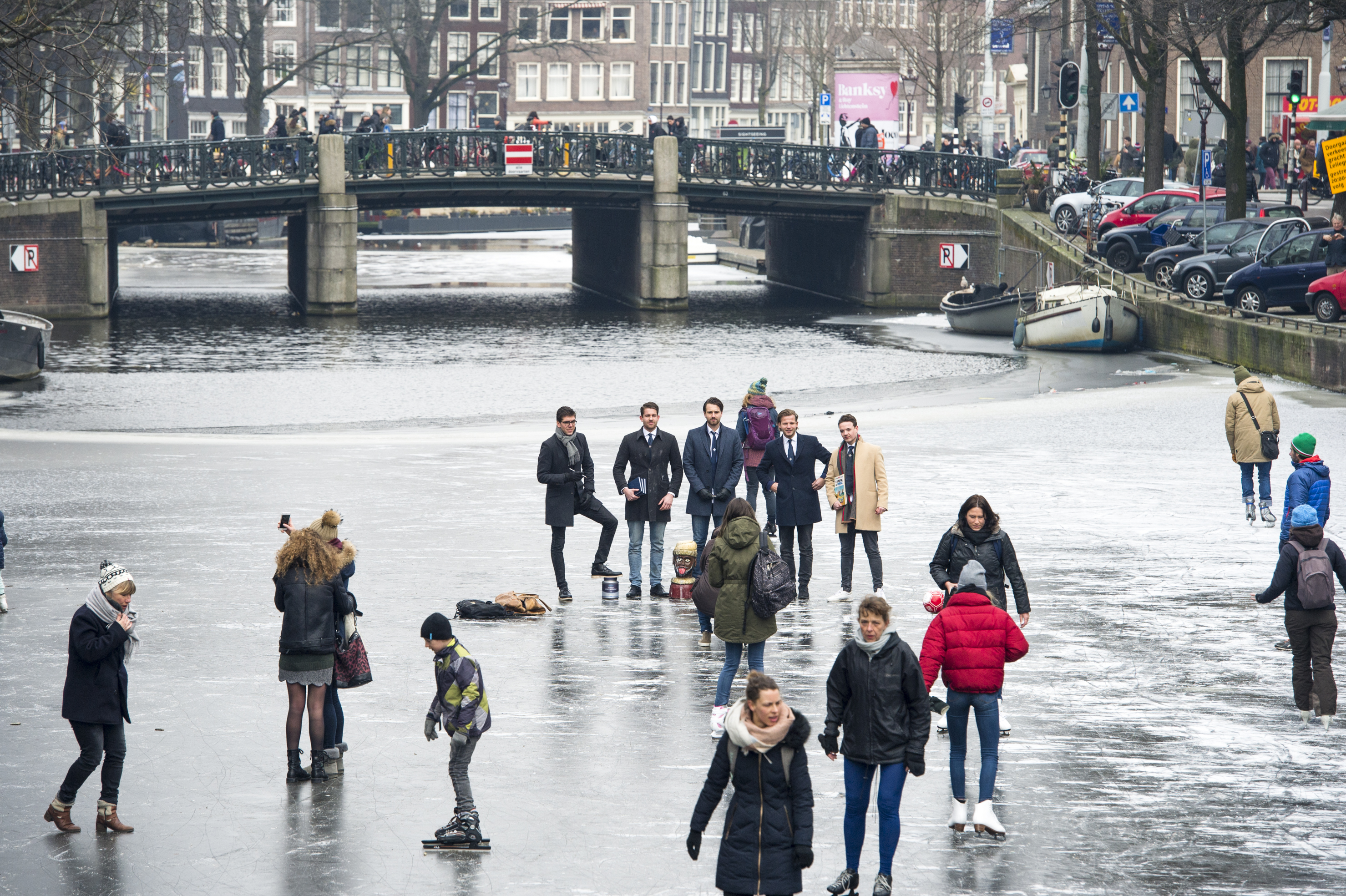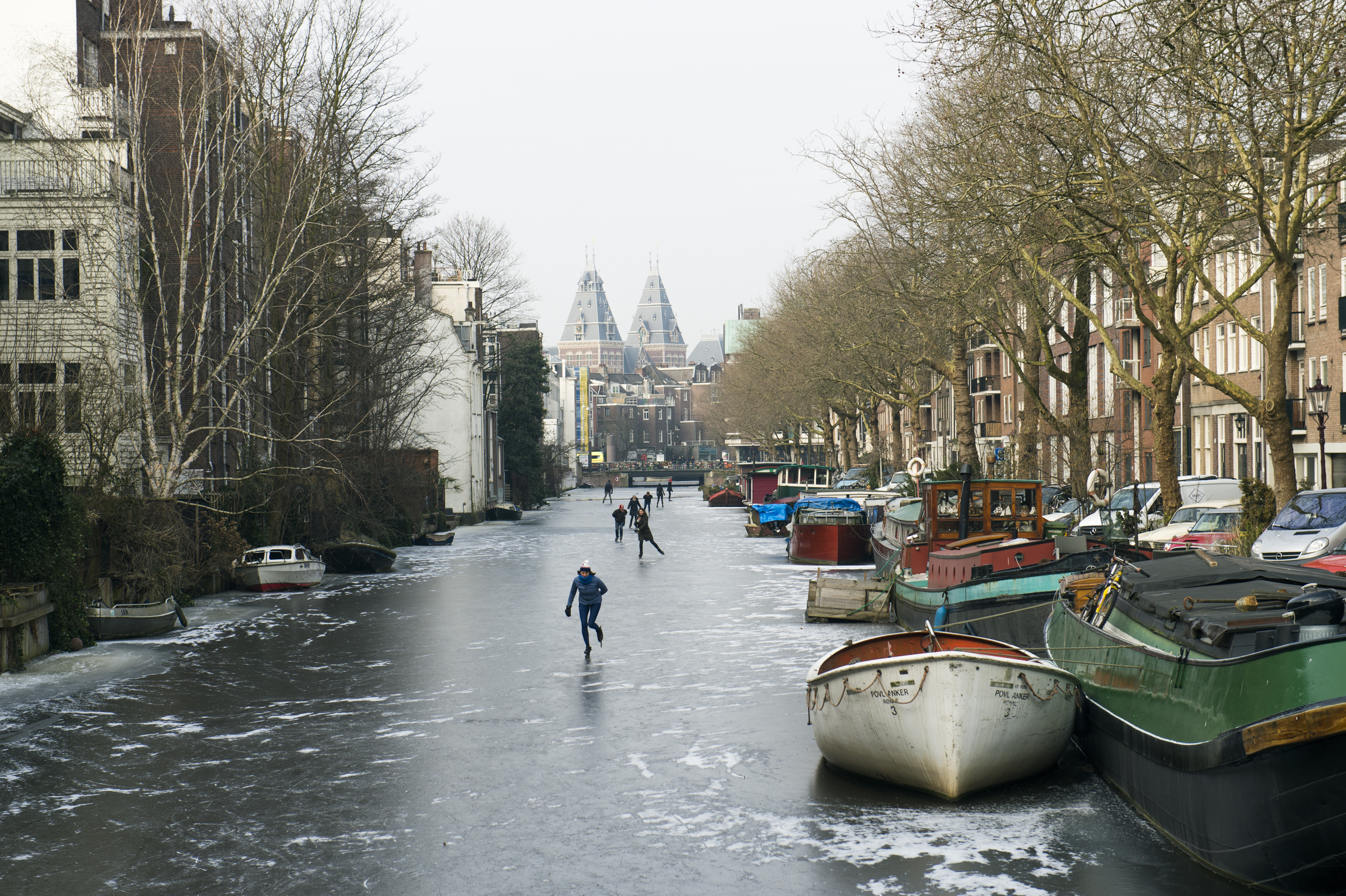 そんな努力のお陰で、プリンセン運河の一部を始め各所に厚い氷が張り、街中がスケートリンクに変身。こんな風にアムステルダムの運河が凍ったのは6年ぶりだ。